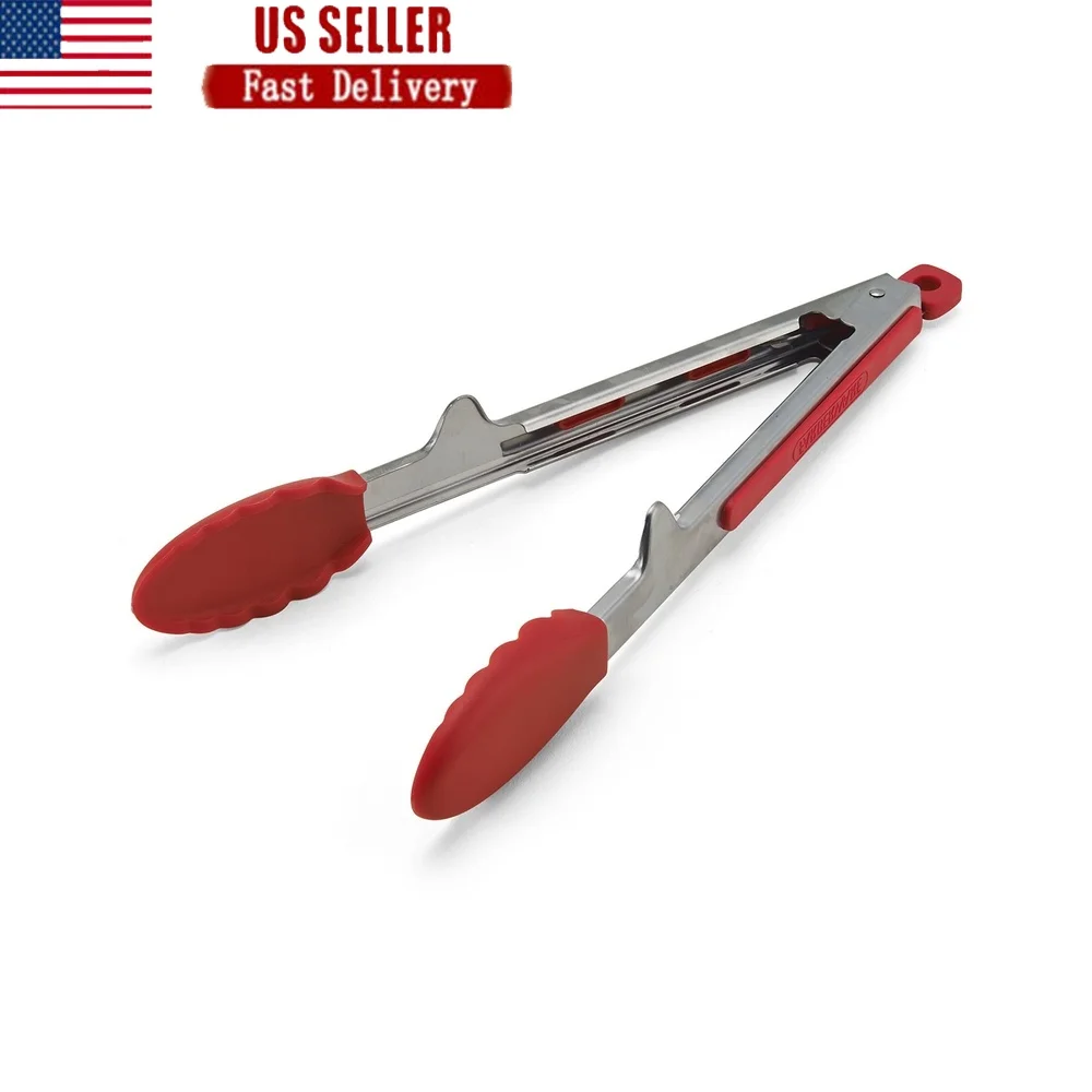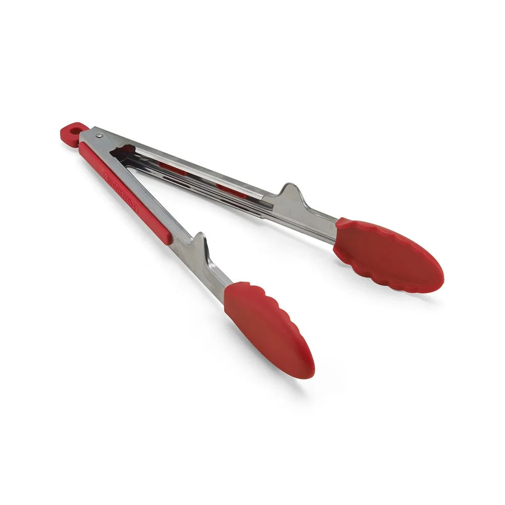 Fresh Red Nylon Kitchen Tongs with Tip-Up Stand are perfect for gently grasping and handling foods, whether serving, cooking on the stove, or grilling. They are constructed of stainless steel with a nylon head that is heat resistant to 450 F and safe on all cookware, including nonstick. They also feature feet that keep the tongs angled and the head off the counter when not in use, and a lock mechanism for convenient storage. Measures 12-1/2-inches. Dishwasher safe.